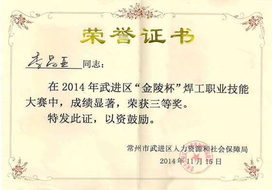 常州一步季昌亚同志荣获焊工技能比赛三等奖